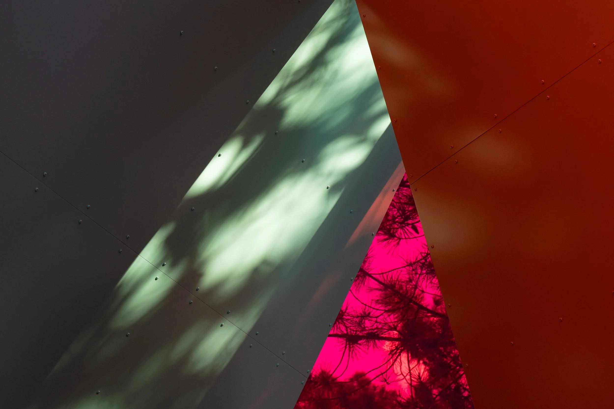 “The work that Croft conceived for Regent’s Park in 2021 is a colossal set of six panes of painted iron (four) and glass (two) that articulate as a huge portico through which one can wander. The set of panes painted in white, red, orange, blue and green alternate in mate and glossy surfaces, complexifying the effect of filters and light reflections provided by the glass panes, which are colored as well.”