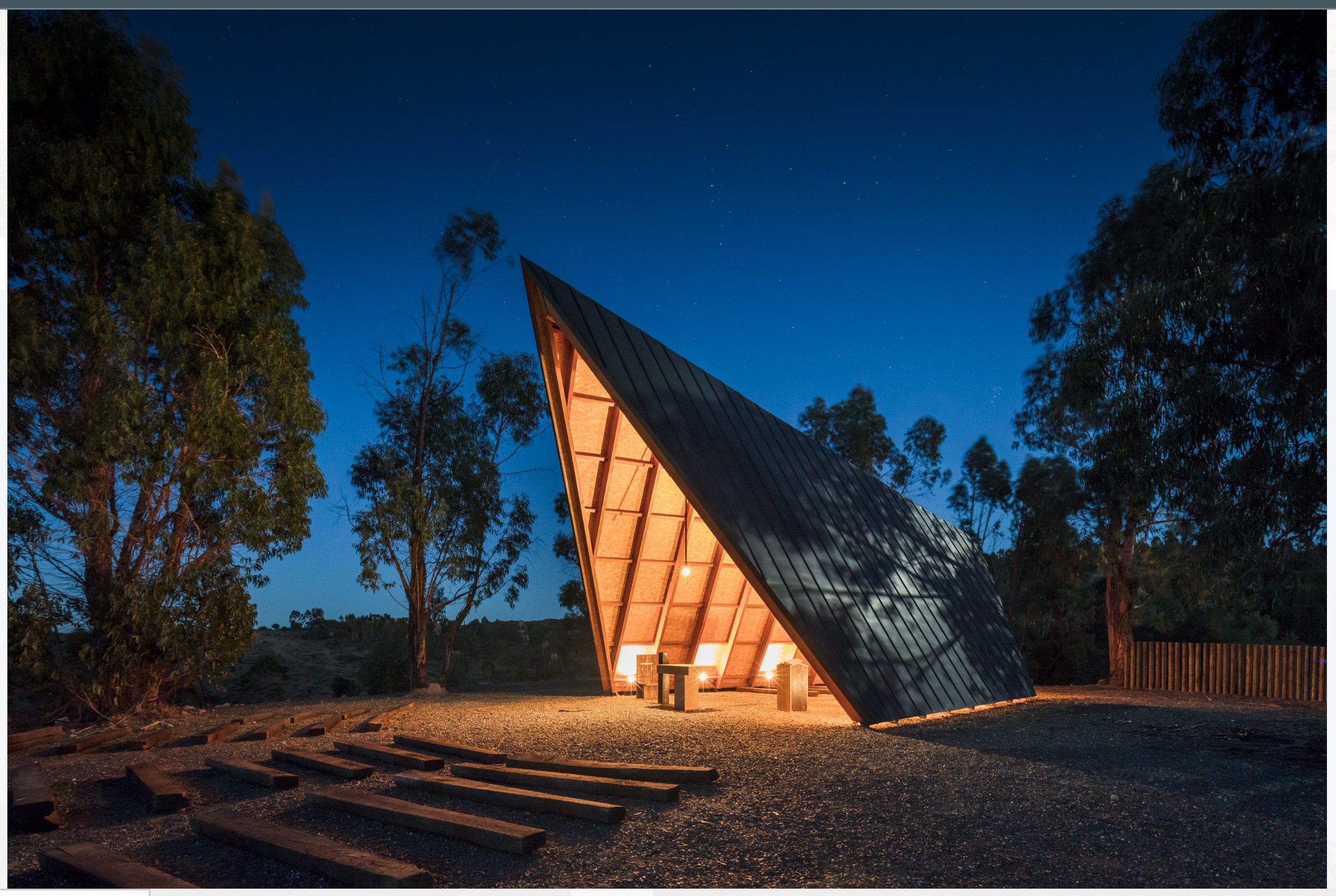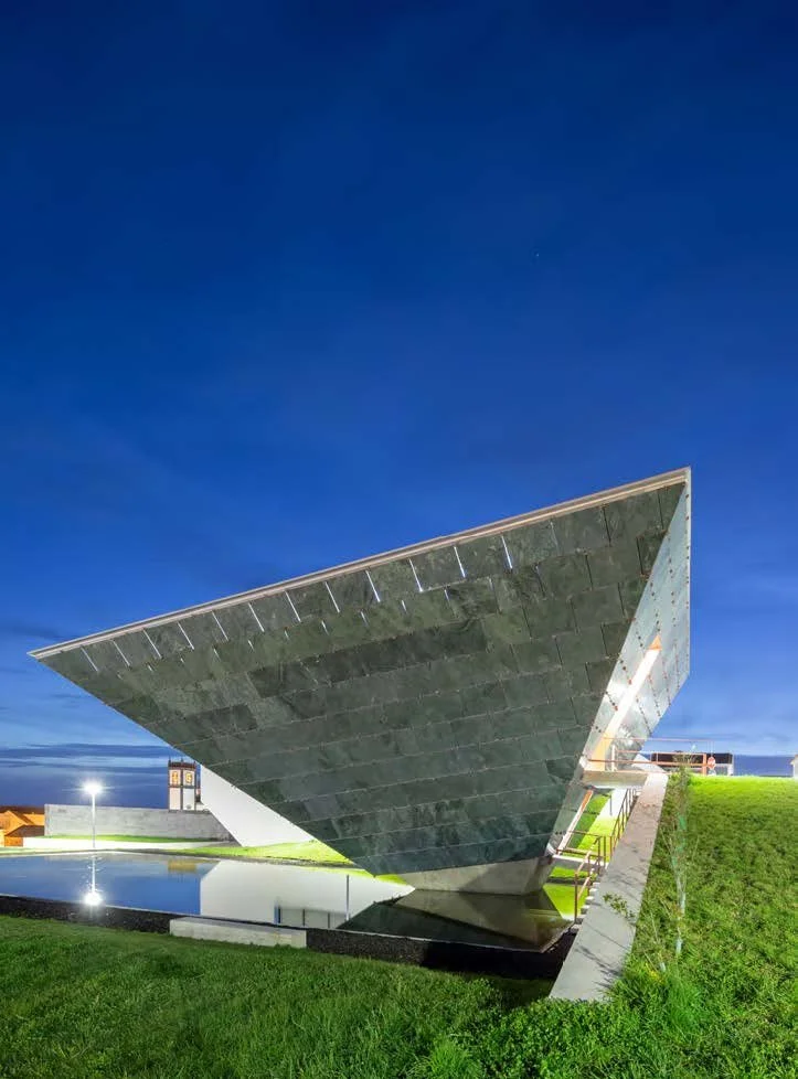 Designed by the architect Nuno Ferreira Capa, this chapel is part of the industrial complex of the Braga construction group DST, in the Teresa Gonçalves Gomes Garden, built in honour of one of the group’s founders. In 2020, it won the Architecture MasterPrize in the small architecture category. Above all, this is a place for reflection and contemplation. The two exposed concrete blocks that make up the chapel are divided by a path that separates the territories: the divine and earthly. Inside, the two levels are marked by the presence of a bench and a hanging cross. At night, the beam of light between the opening and the ends, in Uglass, turns the concrete blocks “into a visually light material”, according to the architect.