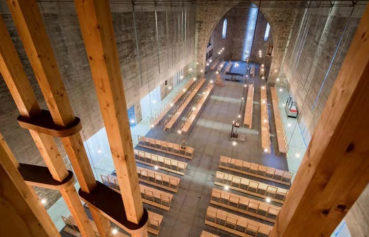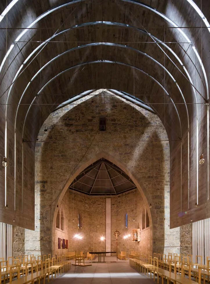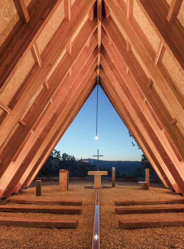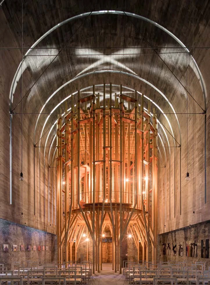 The Cheia de Graça Chapel is part of the Imaculada Conceição Chapel in Braga. The aim of the Cerejeira Fontes Arquitetos project was to restore the chapel and the rood screen, turning it into a space reserved for seminarians. The entire ceiling height was used, as were the exterior stone walls. It is both a meeting point and a place for introspection and silence. In the middle stands the wooden chapel: the different pieces fit together, giving the impression of a forest. The canopy functions as an area reserved for seminarians and, below, visitors can establish contact with the forest’s trees. Surrounding the chapels is a concrete vault, whose slits offer moments of openness, helping filter the sunlight. The project was a finalist at the 2017 National Wooden Architecture Awards, going on to win the 2019 ArchDaily prize for religious architecture.